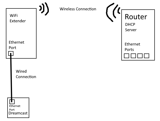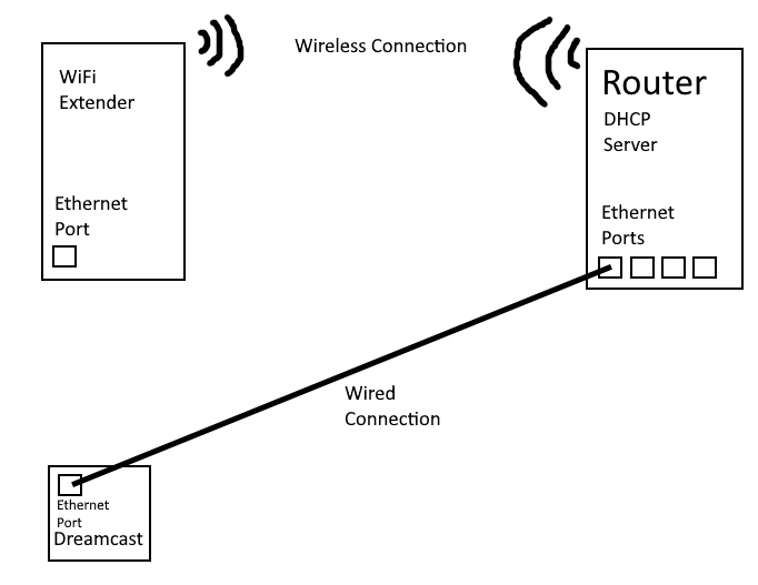 However, whenever I plugged in the Dreamcast and booted up DCLoad-IP, it would not get an IP through DHCP. Eventually, I tried other configurations, trying to find out where the failure is. Connecting the Dreamcast to the router directly allows the Dreamcast to get an address. Other PCs connected to the extender gets an address as expected. The only combo that doesn’t work is Dreamcast to extender.